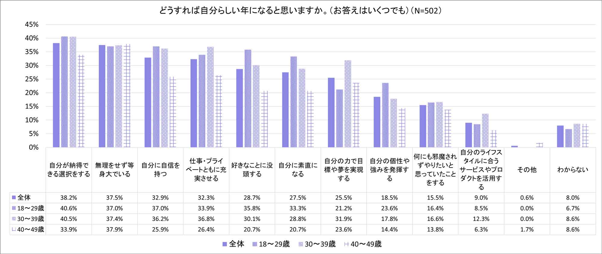 約6割(57.5%)が今年は自分らしい年だったと答え、無理をせず等身大でいられた(29.3%)、自分が納得できる選択ができた(20.9%)、仕事・プライベートともに充実できた(20.6%)などの理由で約半数(48.8%)が自分らしくすごせたと感じている。特に30~39歳女性でこの傾向が最も高い結果となった。(自分らしい年:70.0%、自分らしく過ごせた:79.0%)「自分らしさ」は、性年代ごとに捉え方が代わり、30代の男女を比較すると、男性は「何にも邪魔されずやりたいと思っていたことができたから」「好きなことに没頭できたから」が他の性年代より高い傾向にあり、女性は「自分が納得できる選択ができたから」「無理をせず等身大でいられたから」が高く、男性はより自分がしたいことをすることに、女性は納得感やありのままでいられることに「自分らしさ」をより感じる傾向にあることがわかった。